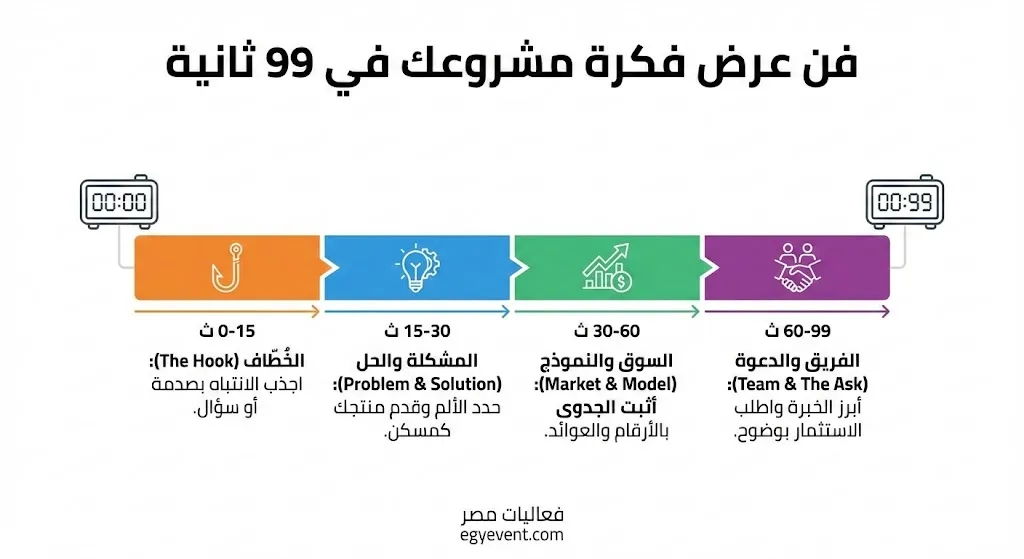 في هذا الدليل الشامل، سنقوم بتفكيك الـ 99 ثانية ثانية بثانية، لنمنحك الهيكل المثالي لعرض لا يُنسى. سننتقل من النظريات الجامدة إلى الخطوات العملية التي يمكنك التدرب عليها اليوم، وسنلفت نظرك إلى أهمية التجربة الحية في فعاليات حقيقية – مثل تلك التي تستضيفها القاهرة حالياً – لتكسر حاجز الخوف وتقف أمام الجمهور والمستثمرين بثقة لا تهتز. استعد، لأن العداد سيبدأ الآن.